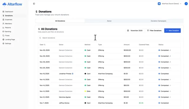 Información completa de los donantes. Rastrea el historial de donaciones, datos de contacto y patrones de ofrendas.